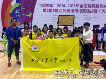 (本网讯)5月13日至17日,在辽宁大连举行的2014-2015年度“培林杯”全国跳绳联赛总决赛暨2015年亚洲跳绳锦标赛选拔赛和第一届全国“科学跳绳校园行”校长论坛上,西安工大附小由于在跳绳运动的开展和推广中成绩突出,被国家体育总局社会体育指导中心、全国跳绳运动推广中心授予“全国跳绳示范学校”,附小代表队也在比赛中再创佳绩。
