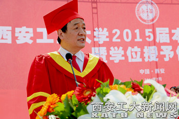 苗润才为毕业生代表拨穗并授予学位。接着,苗润才发表了热情洋溢的讲话。他首先代表学校全体师生员工向顺利完成学业的4579名同学表示热烈的祝贺,向为同学们成长倾注着爱心、汗水和智慧的老师们表示衷心的感谢。他说,今年我们喜迎西安工业大学建校60周年,共同经历并见证了西安工大近几年的辉煌历程。历经60年的风雨,西安工大取得了瞩目的成绩。苗润才谈到,毕业的喜悦和离别的惆怅都不代表着结束,在人生的画卷中,新的一页即将开启,作为同学们的校长、师长和朋友,向所有毕业生提出三点嘱托和期许:一是坚忍不拔、弘扬传统。希望同学们能够继承和发扬“把一切献给党”的兵工精神,践行学校的校风校训,奋发有为。二是学无止境,与时俱进。希望同学们积极钻研,积累经验,要敢于承担重任,善于求是创新,力争做社会可靠的脊梁,做时代前进的先锋。三是静水流深、虚怀若谷。希望同学们怀有一颗豁达之心,不骄不躁,树立正确的人生观,价值观和名利观,传播正能量,建设国家、造福社会。