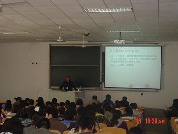 首先,杨卫东科长联系实际阐述了加强大学生安全管理的必要性和紧迫性,带领大家学习了学校近年来出台的有关大学生安全管理及消防管理的相关文件。接着,杨科长利用课件旁征博引并举例说明,语言幽默风趣,深入浅出,使整个讲座高潮迭起,掌声不断。在讲座中,杨科长简介了我国高等院校的消防现状,阐述了如何引起宿舍火灾,介绍了大学生遇火逃生的自救基本方法、如何正确使用灭火器、以及树立安全防火的重要性等。最后杨科长强调安全消防工作还需要全体师生的支持,希望在场的每一位同学积极的做好消防安全知识的宣传,并且积极的参与到我校的消防安全工作当中来,与保卫人员携起手来一起营造一个良好的安全生活环境。