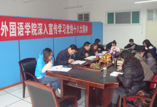 (本网讯)11月29日下午,西安工业大学外国语学院党总支部中心组集体学习党的十八大精神。学院党总支部书记张文孝主持并做主题发言。强调要认真学习贯彻十八大精神,准确把握十八大提出的新思想、新观点、新论断,积极落实学校各项工作要求和部署,奋发有为、兢兢业业、扎扎实实地做好学院各项工作。