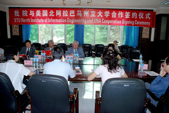 (本网讯)8月28日,美国北阿拉巴马州立大学校长William G. Cale,Jr校长访问西安工业大学北方信息工程学院。北方信息工程学院董事长刘江南教授、副院长薛虹教授在金花校区与William G. Cale,Jr校长进行了亲切友好的会谈,双方就“2+2” 、“3+2”模式合作事宜充分交换了意见并达成了共识,签署了合作协议。