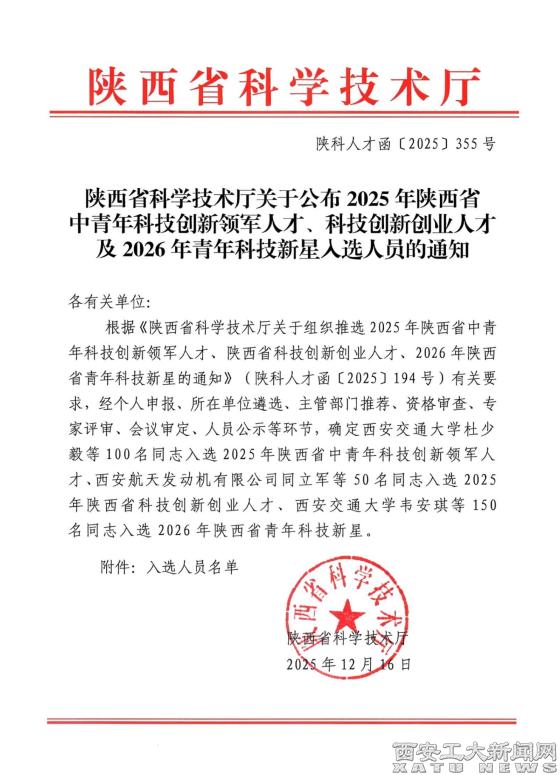 (本网讯)近日,陕西省科学技术厅公布了2025年陕西省中青年科技创新领军人才及2026年陕西省青年科技新星入选人员名单,我校共有7名教师成功入选,入选人数居省属高校前列。材料与化工学院金洗郎教授等2名教师入选2025年陕西省中青年科技创新领军人才,光电工程学院谭振坤副教授、机电工程学院张传运副教授、新能源科学与技术研究院崔文岗副教授、基础学院霍晋荣副教授、兵器科学与技术学院陶玙副教授5名教师入选2026年陕西省青年科技新星。