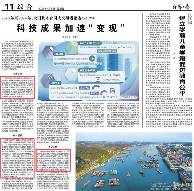 (本网讯)科技成果转化是发展新质生产力的题中之义,党的二十届四中全会明确提出“推动科技创新和产业创新深度融合”。1月8日,国家三大报之一的《经济日报》刊登《科技成果加速“变现”》报道,其中推介我校科技成果转化经验与做法。《经济日报》关注我校,在历史上尚属首次。