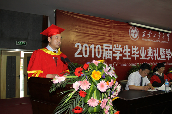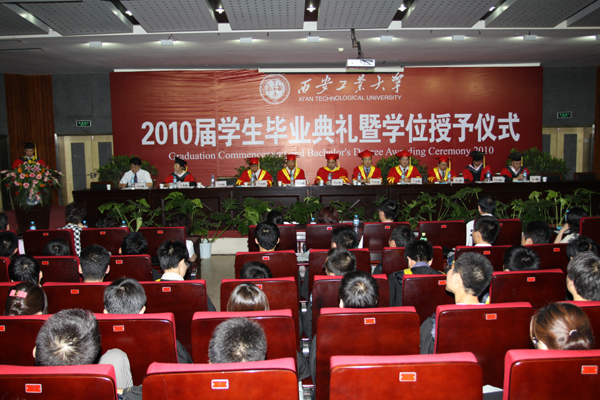 (本网讯)7月1日上午,西安工业大学在未央校区学术报告厅隆重举行2010届学生毕业典礼暨学位授予仪式。党委书记赛云秀、副校长张君安、党委副书记丁养斌、党委副书记于孟晨、纪委书记许尚年、副校长陈桦,党办、校办、团委、教务处、学生处、国际交流处(校友总会)等部门和院系领导出席了毕业典礼和学位授予仪式,部分学生家长也应邀来到仪式现场。