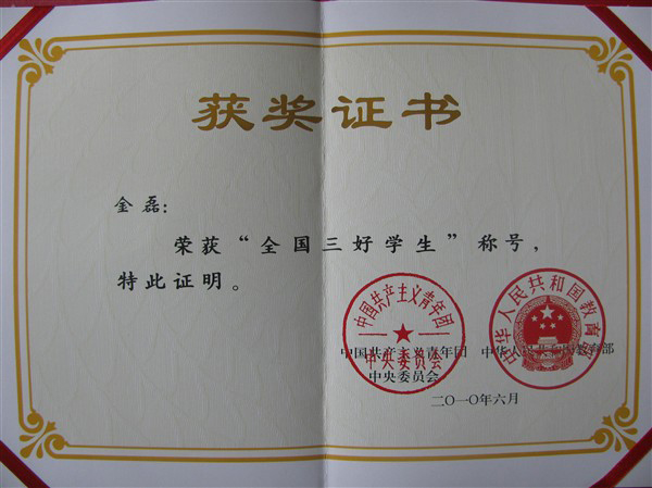 (本网讯)2010年6月,西安工业大学 2009届毕业生、07-08学年西安工业大学“十佳大学生”、经济管理学院经济学专业学生金磊,被团中央、教育部授予“全国三好学生”荣誉称号。