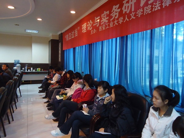 研讨会以近期发生的社会热点案件即东莞林振祥案件以及陕西肖昌勇案件为契机,围绕防卫过当的理论与实务问题展开了热烈的探讨。陕西省高院刑一厅副厅长刘仲屹法官首先对关于防卫过当与否的认定、防卫过当行为主观心态、防卫过当行为罪名的确定以及量刑的把握等相关问题进行了梳理与澄清,并指出防卫过当在司法认定中应该注意的问题;同时,刘法官还以高院不同时期的判决为据,指出法院系统十年来在保护公民正当防卫权方面做出的努力。在激烈的研讨中形成三个焦点问题:一是如何具体判断、认定防卫行为是否明显超过必要限度造成重大损害,二是正当防卫与防卫过当的关系问题,三是关于特殊防卫权成立条件的准确理解与司法适用问题。与会嘉宾不仅旁征博引,比较中外立法与理论差异,更是对我国的司法实务与理论的共生互动问题给予了热切的关注,分析法理、剖析案例、反思立法,思索法律规定与社会现实、司法裁决与舆情民意的平衡与和谐,对防卫行为正当与过当、合法与非法的界定以及刑事责任的承担等理论与实务问题深入挖掘解剖。陕西高院刑一厅副厅长刘仲屹法官、马云法官、陕西律师协会刑事辩护委员会耿民主任律师、陕西永嘉信律师事务所李秀梅律师、陕西普迈律师事务所田宏伟律师、澳门日报特约记者张伯庆先生、西北政法大学刑事法学院副教授陈京春博士、陕西科技大学法律系范连玉副教授、陈敏博士等专家学者均发表了精辟的见解,我校法律系教师李金玉、王宏斌、郑淑霞、张玲艳等表达了个人独到的观点,会议气氛热烈活跃、思想火花四溅,掌声迭起。