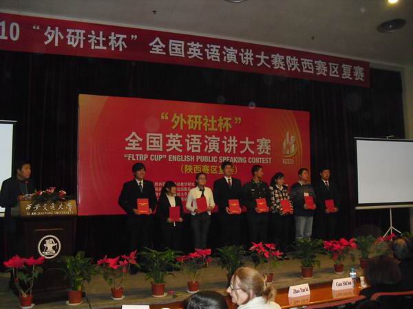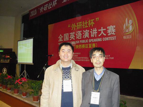 (本网讯)2010“外研社杯”全国英语演讲大赛(陕西赛区)于11月20日在西安交通大学举行,来自全省各高校的44名参赛选手进行了较量。西安工业大学选拔的参赛选手张新辛及其指导教师马安平参加了此次大赛并获得二等奖。