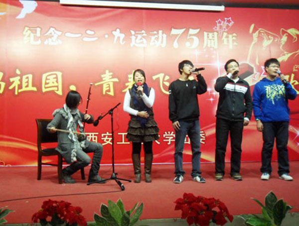 (本网讯)12月8日晚,西安工业大学团委在未央校区举办纪念“一二·九运动”75周年——“歌唱祖国 青春飞扬”红歌会。之前,校团委宣传部对来自不同院系、不同年级的30余个报名的曲目,进行了初审、复审等环节,最终挑选了14个优秀的表演团队及个人登台演唱。