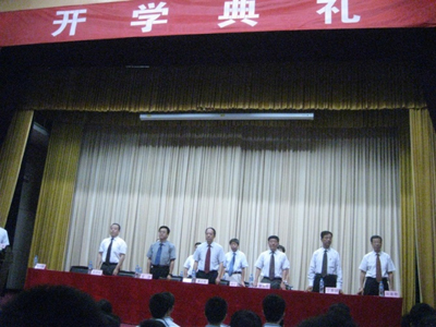 典礼在庄严的国歌声中开始。赛云秀书记首先代表学校领导向全体新同学致辞。希望新同学们在校不仅要专注学业,努力将自己培养成为创新型人才。更要努力培养务实进取、脚踏实地的精神,一步一个脚印,踏踏实实地去实现自己的人生目标。不断修炼思想政治素质,学会做人,不虚度光阴,努力成为国家的栋梁之才。