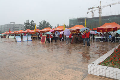 各院系亮眼的迎接亭也都在经纬广场两侧整齐地排成两列,志愿者们耐心周到的服务受到了新生及新生家长的高度好评。保卫处也在新生报到期间开放门禁,特别为前来报到的自驾车留出从学校西大门到经纬广场前的空地免费停车。在图书馆大厅,学校集中设置了招生办公室咨询处、新生缴费处、户籍办理处、新生绿色通道办理处等以便前来报到的新同学能在一个地点完成多个报到手续。