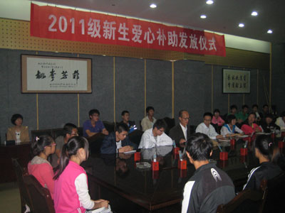 (本网讯)9月16日,西安工业大学学生处在图书馆第一会议室举行2011级新生爱心补助发放仪式,学生处副处长姬洪波、资助管理中心全体人员以及33位家庭经济困难新生参加了仪式。