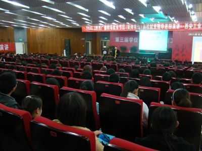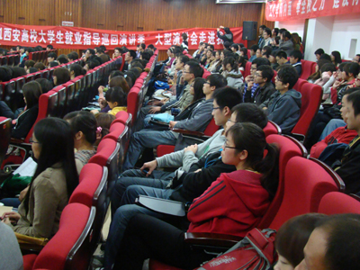 (本网讯)11月3日晚,应西安工业大学学生处大学生就业指导服务中心邀请, FM101.1陕西首档广播职场就业节目《张持有道》高校大学生就业指导巡回演讲第九站——西安工业大学演讲会在未央校区图书馆报告厅举行。本次就业指导巡讲活动由西安市人才服务中心、FM101.1《张持有道》栏目、西安毕业生就业市场共同组织,腾讯微博进行了现场微博直播互动。演讲会由FM101.1《天天向上》栏目主播小萌老师主持, FM101.1《张持有道》栏目主播张持老师携4位资深导师组成的团队走进校园,为我校大学生做了精彩的就业问题演讲。我校500余名同学参加了此次活动。