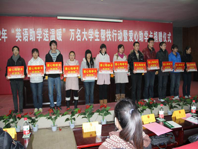 (本网讯)12月30日,共青团陕西省委“英语助学送温暖”万名大学生帮扶行动暨爱心助学卡捐赠仪式在西安工业大学未央校区举行。团省委副书记张小平、校党委副书记丁养斌、省学联副秘书长辛磊、校团委书记赵琼、四海嘉华科技有限公司(嘉学网)总裁文小红等出席。陕西科技大学、西安医学院、西安工程大学等全省二十多所高校的学生近400人参加了捐赠仪式。团省委学校部部长、省学联秘书长单舒平主持了捐赠仪式。