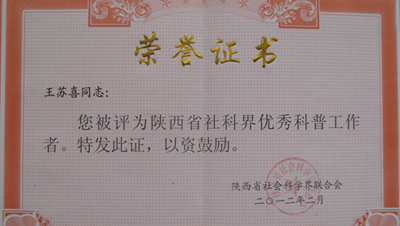 我校思政部王苏喜教授因其多年来在哲学社会科学方面的研究与宣传普及工作,被评为“陕西省社科界优秀科普工作者”,受到大会隆重表彰。
