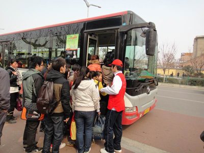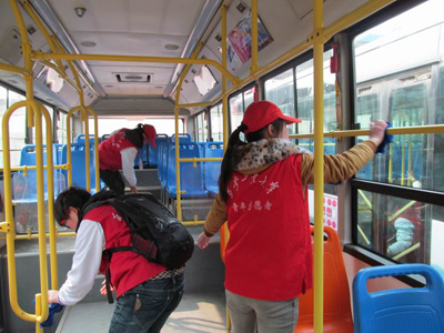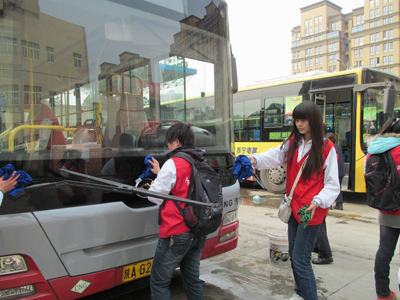 活动中,一部分同学在张家堡以及公交六公司乘车站负责维持乘车秩序,为市民提供一个良好的、有序的乘车坏境做出自己的努力;一部分同学清洗600路公交车内部,经分队分组到分工,大家便开始忙了起来,打水的、擦座位的、擦车窗的,大家都有条不紊地进行着。由于每辆公交车都还在运行状态,车辆不停的进站出站,每辆公交车在站内的停靠时间只有三四分钟,但同学们积极配合,高效地完成一辆又一辆进站车辆的清洗。