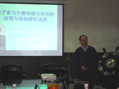 聘任仪式后,张丰收教授为在场的师生作了题为“粒子束与生物体相互作用的应用与基础研究进展”的精彩学术报告,主要介绍了粒子束在生物体诱变改性中的应用和作用机理,并对我校发展离子束生物工程在队伍建设、应用开发、配套设施以及科研合作等方面提出了宝贵的意见。