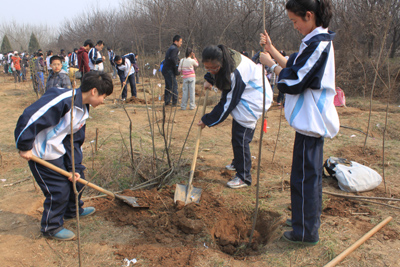 (本网讯)绿化常留春色,植树造福后人。3月11日下午,西安工业大学附中为了进行新课改社会实践活动,对学生进行生动的环保教育,政教处、校团委组织高一年级全体学生来到西安杜陵,开展植树活动。