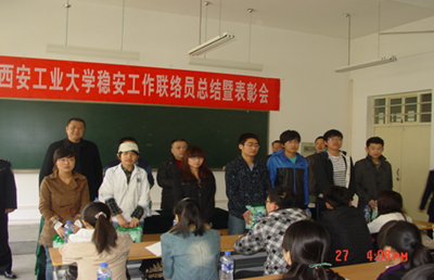 最后,保卫处政秘科科长李伟分别向为学校稳安工作做的较好的37位同学颁发了纪念品。强调了学校稳定对国家、社会、民族稳定的重要作用。并要求稳安工作联络员要以校园的稳定为己任,把校园安全当作大事,为学校的稳定安全多做努力。