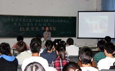 (本网讯)5月23日,为纪念延安文艺座谈会召开70周年,党委宣传部、校工会、校团委邀请校工会教师王小珏在未央校区举行了《红色文化 黄土歌谣》----陕北民歌欣赏专题讲座。党委宣传部部长李金钢、团委书记赵琼和全校部分文艺骨干参加了本次讲座。