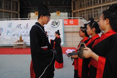 祭祀屈原典礼仪式在身穿汉朝祭祀礼服赞礼的宣布中正式开始,三位主祭和六位执事分别完成了进位,宾盥,上香,进奠币,三献礼(初献,亚献和终献)宣读祭文,退班等一系列的祭祀流程。庄严肃穆的祭祀典礼使现场充满了浓浓的传统文化气息,让现场观众深深感触和了解到端午节的民俗传统文化。紧接着开展兰汤祓禊环节,身着汉服的主礼手持菖蒲,在铜盆沾水后向同学洗礼祈福。整个仪式在射五毒,斗蛋,投壶,包粽子等传统文化活动体验中圆满结束。