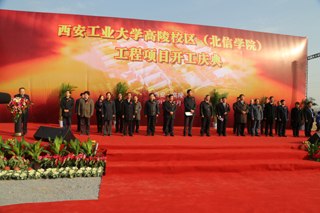 (本网讯)11月19日上午,西安工业大学举行高陵校区(北信学院)开工庆典仪式,现场礼乐齐鸣、彩旗飘扬。陕西省省教育工委副书记、省教育厅副厅长梁宝林,西安市政府副秘书长焦为发,中共高陵县县委书记李毅,西北兵工局副局长庞改农,西安工业大学校长廉振民,党委副书记丁养斌、于孟晨,纪委书记许尚年,副校长、北方信息工程学院董事长张君安,副校长陈桦,总会计师段小存及陕西省教育厅、西北兵工局、高陵县、北信学院主要领导莅临庆典现场,与干部代表和部分职工代表、兄弟兵工单位代表、施工单位、学生代表等近600人共同见证了这项盛事。