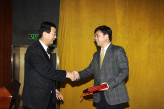 受廉振民校长委托,丁养斌副书记向王战峰先生颁发了聘书,并讲话指出,王战峰先生受聘我校兼职教授,对我校人文学院的发展,同时对学校社会地位的提升将起到积极作用。