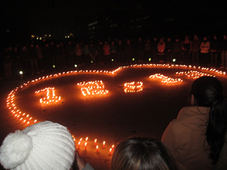 75年前的12月13日,侵华日军攻占南京,制造了人类历史上骇人听闻的“南京大屠杀”,屠城持续了六周之久,30余万中国民众惨遭杀害。75年后重温这段惨痛历史,不是为了记住和延续仇恨,而是警醒当代青年学生要铭记历史,铭记我们的国家和民族曾经遭受的灾难。只有真切的了解历史,才能正确的认识历史;只有以史为鉴,才能面向未来。活动现场共燃起500只蜡烛,拼成“心”型,现场学生齐声演唱了《让世界充满爱》、《明天会更好》等歌曲,并在活动的开始与结束向南京大屠杀遇难同胞分别默哀三分钟。