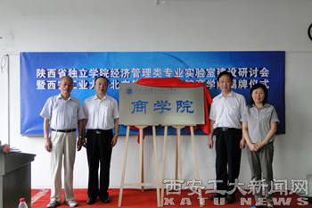 (本网讯)近日,陕西省独立学院经管类专业实验室建设研讨会暨西安工业大学北方信息工程学院商学院揭牌仪式在北信学院举行。院长张君安、党委书记简林根、副院长薛虹、党委副书记杨灏、西北大学出版社副总经理张萍出席。