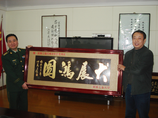 西安工大领导同武警工程学院副院长谷安彪少将、训练部部长贾红威少将及各系的领导进行了友好会谈,双方介绍了各自学校的发展情况和今后的合作意向。党委副书记丁养斌、副校长张君安代表西安工大向武警工程学院赠送了匾额,随后参观了武警工程学院教学控制中心和校区。