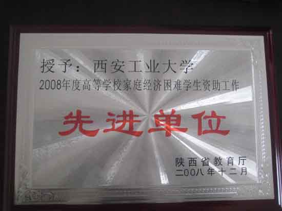 (本网讯)在陕西省教育厅组织的2008年资助工作检查评比总结活动中,西安工业大学被授予“2008年度高等学校家庭经济困难学生资助工作先进单位”称号。