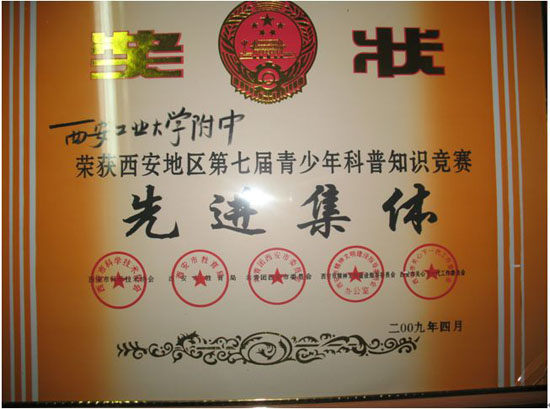 (本网讯)在近日举办的2009年西安地区第七届青少年科普知识竞赛中,西安工业大学附中高二(4)班辛静等12名同学分获一、二、三等奖,附中被评为“先进组织单位”,陶红同志被评为“先进组织个人”。