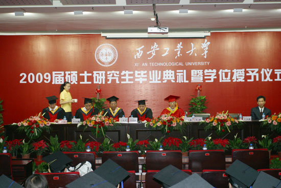 (本网讯) 5月26日上午,西安工业大学在未央校区隆重举行2009届硕士研究生毕业典礼暨学位授予仪式。校长刘江南、党委书记赛云秀、党委副书记丁养斌、副校长陈俊斌、校长助理研究生部主任陈桦以及部分2009级硕士研究生导师参加了仪式。授予仪式由研究生部副主任张群主持。