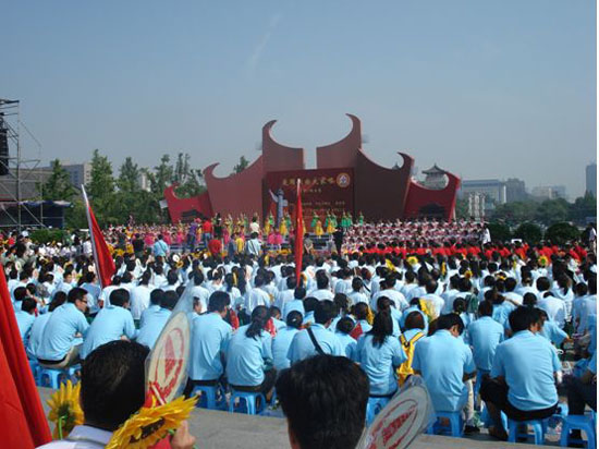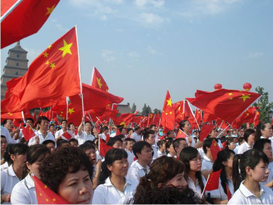 (本网讯)为迎接祖国60周年华诞,努力构建和谐社会,7月12日,由中共中央宣传部、中央文明委等10部委主办的中央电视台《激情广场》栏目 “爱国歌曲大家唱”群众歌咏活动在西安大雁塔北广场隆重举行,西安工业大学40余名师生在团委组织下参与了此次活动