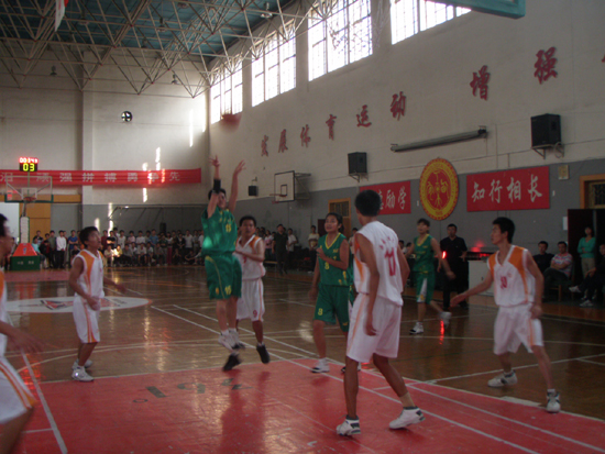 此战,校女篮对阵的是金花校区男篮。比赛从一开始,比分就交替领先。女篮凭借自身身高与技术优势和队员之间配合默契团结协作,流利而漂亮的传球、上篮、得分,赢得了观众的阵阵掌声和狂热的呐喊。然而男篮也不甘示弱,调整战术进行反攻,双方激烈鏖战,最后男篮以2分的优势险胜校女篮。
