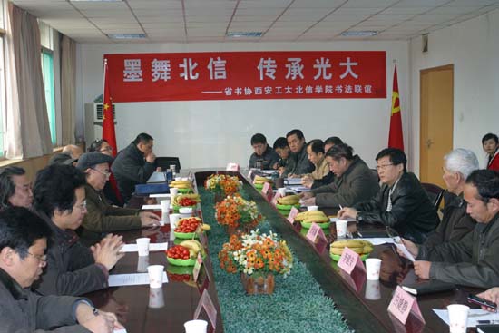 (本网讯)12月24号上午,“墨舞北信,传承光大——省书协西安工业大学北方信息工程学院书法联谊”会在北信学院举行。陕西省书法协会主席雷珍民先生、副主席张山先生,我校校长、北信学院董事长刘江南出席了联谊活动,艺术学院院长于唯德、北信学院领导以及相关人员参加了此次联谊活动。