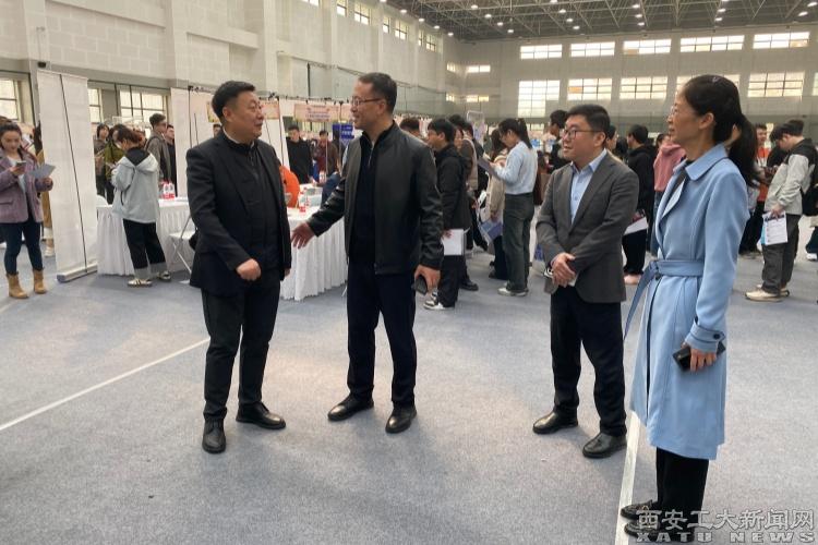 (本网讯)10月30日,西安工业大学2026届毕业生秋季大型校园招聘会(综合类第七场)在未央校区体育馆圆满举行。西安市委党委统战部副部长原大刚、我校党委副书记马福莅临招聘会现场指导。