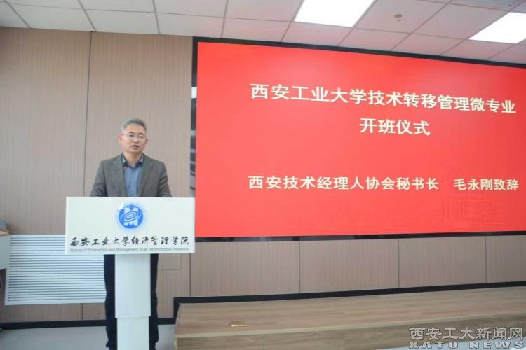 西安技术经理人协会秘书长毛永刚代表合作单位致辞。他从行业实际出发,深入剖析了当前技术转移领域的发展趋势与人才缺口,强调高素质技术经理人在贯通创新链与产业链中的关键角色,并对微专业的课程设计与实践导向寄予厚望。