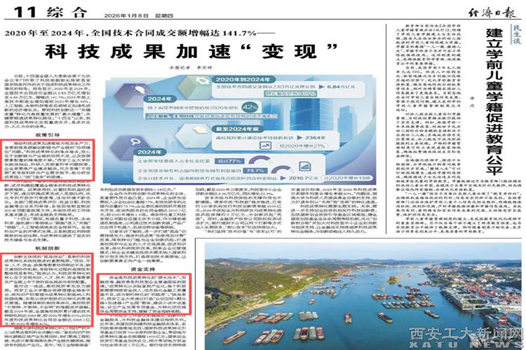 (本网讯)科技成果转化是发展新质生产力的题中之义,党的二十届四中全会明确提出“推动科技创新和产业创新深度融合”。1月8日,国家三大报之一的《经济日报》刊登《科技成果加速“变现”》报道,其中推介我校科技成果转化经验...
